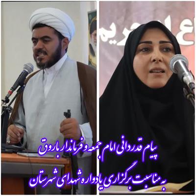 حجت الاسلام غلامرضا کبیری امام جمعه و خانم مریم مسرت فرماندار شهرستان باروق با صدور پیامی مشترک از حضور آحاد مختلف مردم ولایی و شهیدپرور در مراسم یادواره شهدای شهرستان و همچنین از تلاش خالصانه کلیه متولیان در جهت هرچه بهتر برگزار شدن یادواره 161 شهید والامقام و به ویژه پنج شهید جنگ 12 روزه شهرستان تقدیر و تشکر کردند.