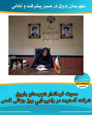 دعوت فرماندار شهرستان باروق از همه اقشار مختلف مردم شهرستان باروق، خانواده های معظم شهدا، جانباران، ایثار گران، فرهنگیان،ادارات، ارگانها، دهیاران، شوراهای اسلامی شهر و روستا،ریش سفیدان معتمدین ارجمند شهرستان باروق برای شرکت گسترده در راهپیمایی روز جهانی قدس